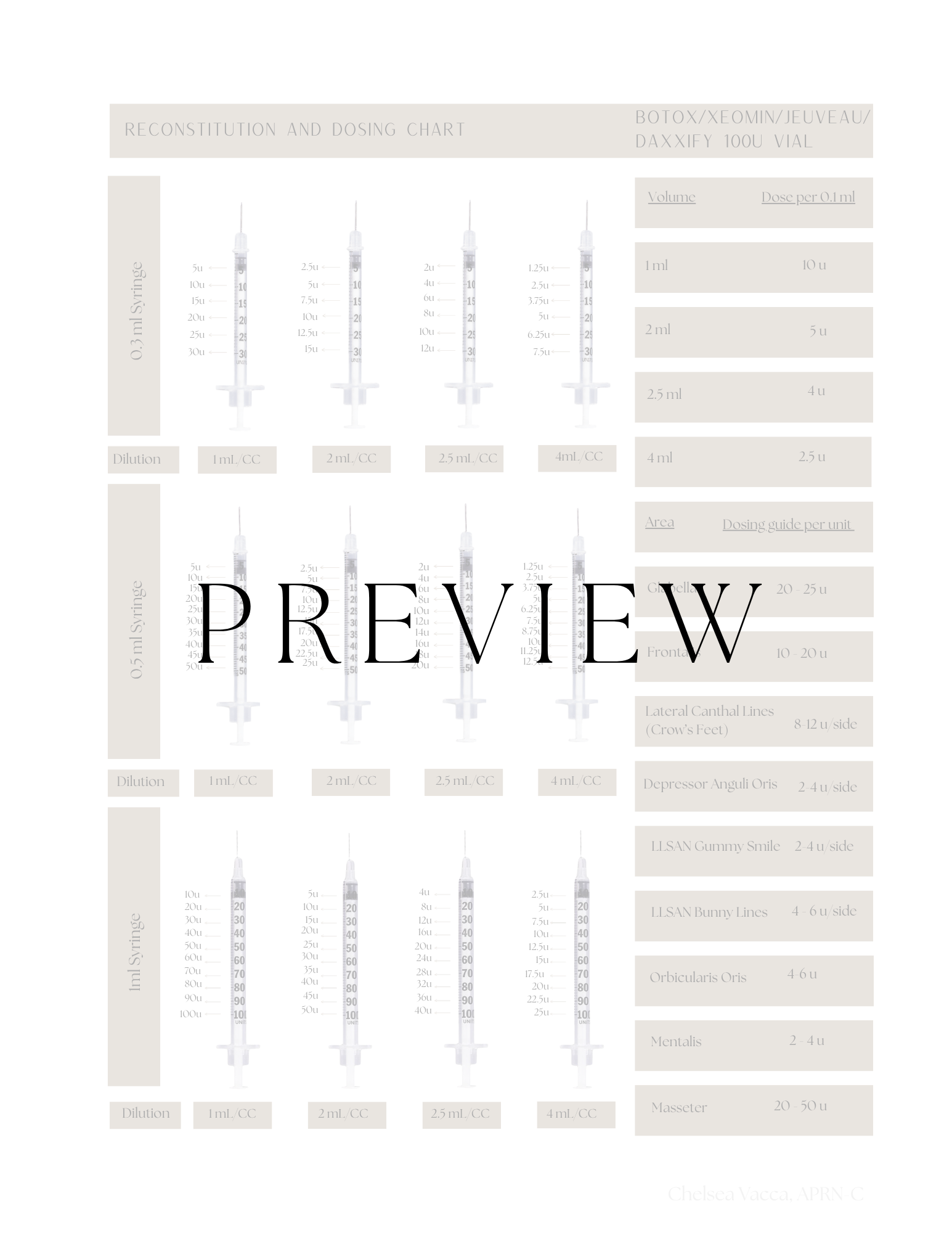 Simplify Botox reconstitution and dosing with the Injector's Botox Guide—a clear, easy-to-use Botox Reconstitution Guide and Dosage Chart designed to support nurse injectors, med spa professionals, and aesthetic practitioners. This downloadable resource helps you work confidently and efficiently in your practice.
